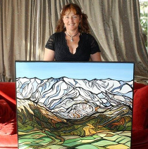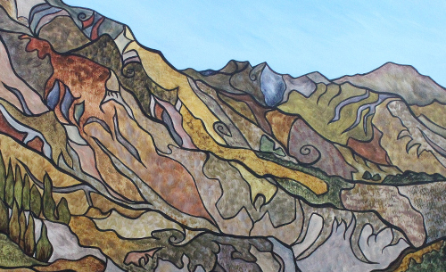 Mainly painting landscapes, Miranda speaks about past and present of her homeland New Zealand in her work, creating striking pieces with a distinctly South Pacific feel. Miranda is interested in events that have shaped the landscape from ancient times, when Zealandia broke away from Gwondana Land, through to the recent events of human habitation. Pattern and movement are strong elements in Miranda’s work. A variety of brush strokes are used in both opaque and translucent layers, bringing vibrancy to the work. Clean lines define forms and provide clarity.