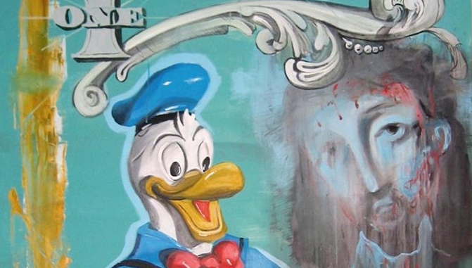 John Chester Kaine creates his work in the Pop Art tradition using images found in magazines or found photos: Disney's figures, photos of film-stars and fashion photos. Colorful California and Mexico is his muse. Sometimes political or philosophical contents are adopted. John introduces an unusual and exciting mosaic of figures in every painting to the observer inviting him to see the world from a different point of view. For example you will ask yourself why John painted Jesus and Donald Duck in one painting and it might keep your mind busy guessing what these two have in common.